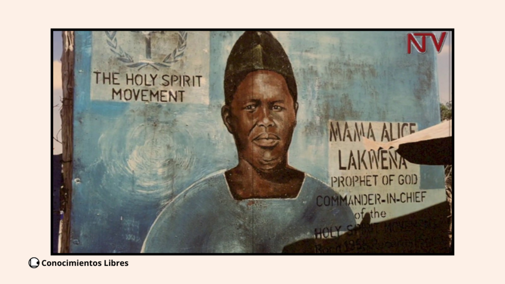 Ilustración: Esta imagen muestra un mural de Alice Lakwena (también conocida como Alice Auma). Fundadora del The Holy Spirit Movement. Autoproclamada profetisa de Dios y comandante en jefe de sus fuerzas militares.